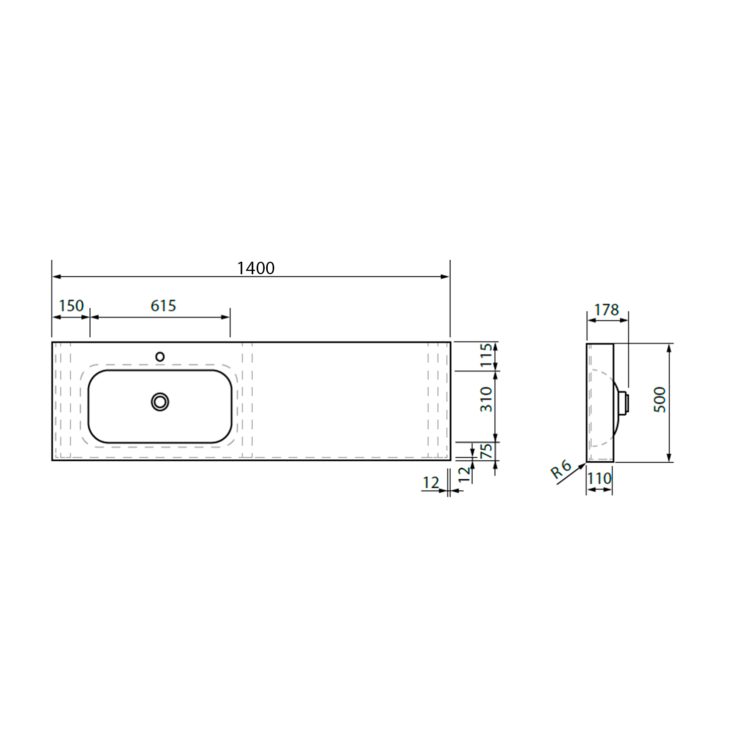Zátka umyvadlové výpusti je vyrobena ze stejného materiálu jako umyvadlo. V otevřené poloze je zátka v jedné rovině se dnem umyvadla. Umyvadlo lze umístit i do vyzděné niky. Doporučujeme instalovat každých 70 cm podpěrnou konzoli.