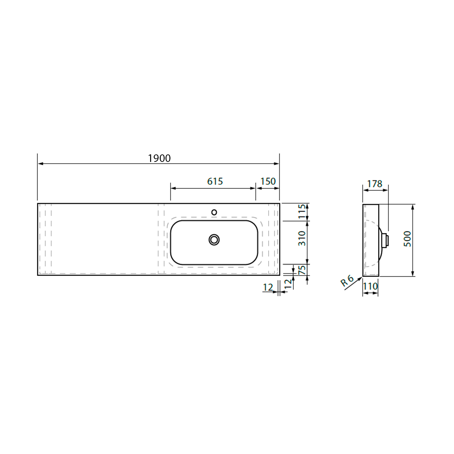 EMICO umyvadlo, Rockstone, 190x50cm, límec L, levé, bílá mat