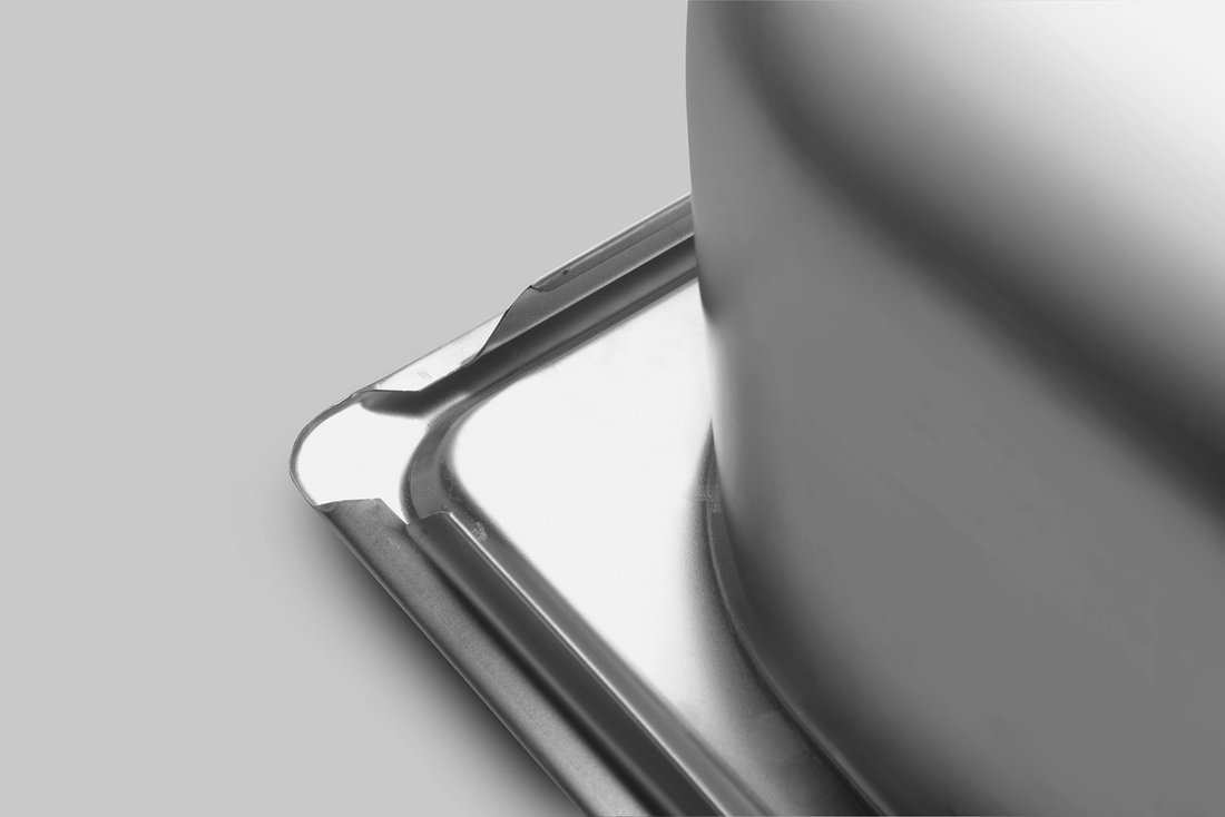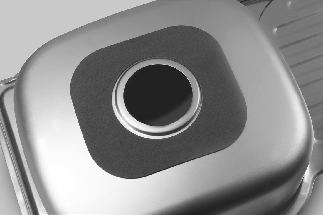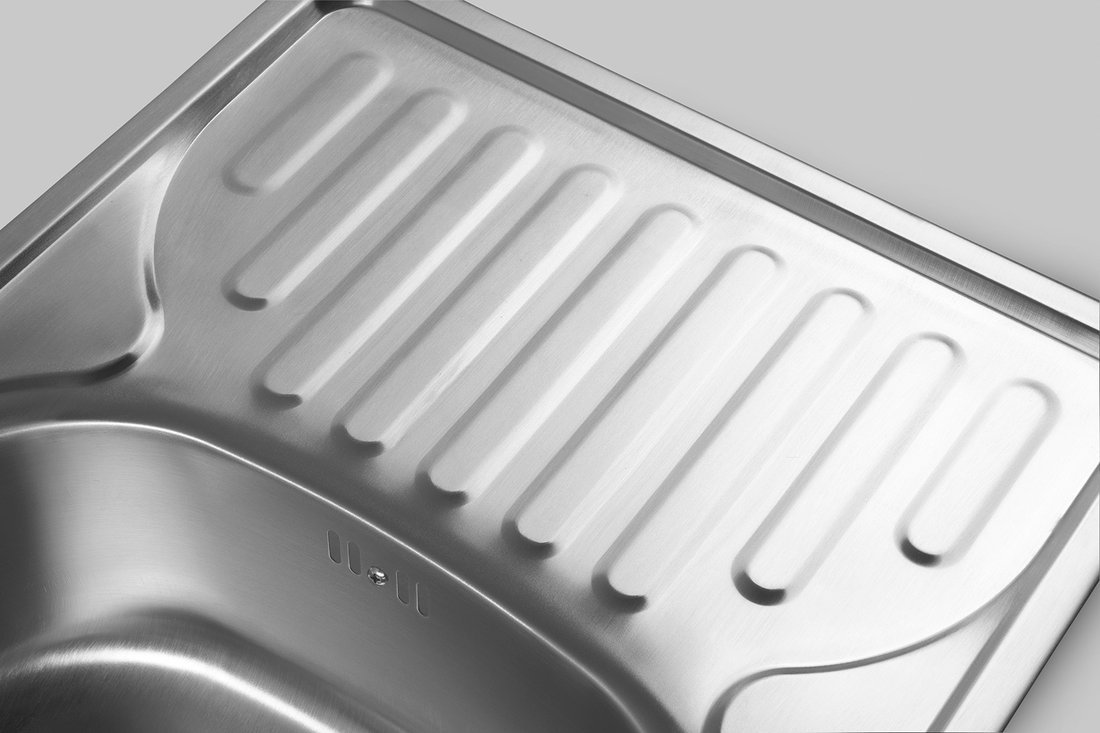 Dřez je usazen na pracovní desku a hranou ji převyšuje. |