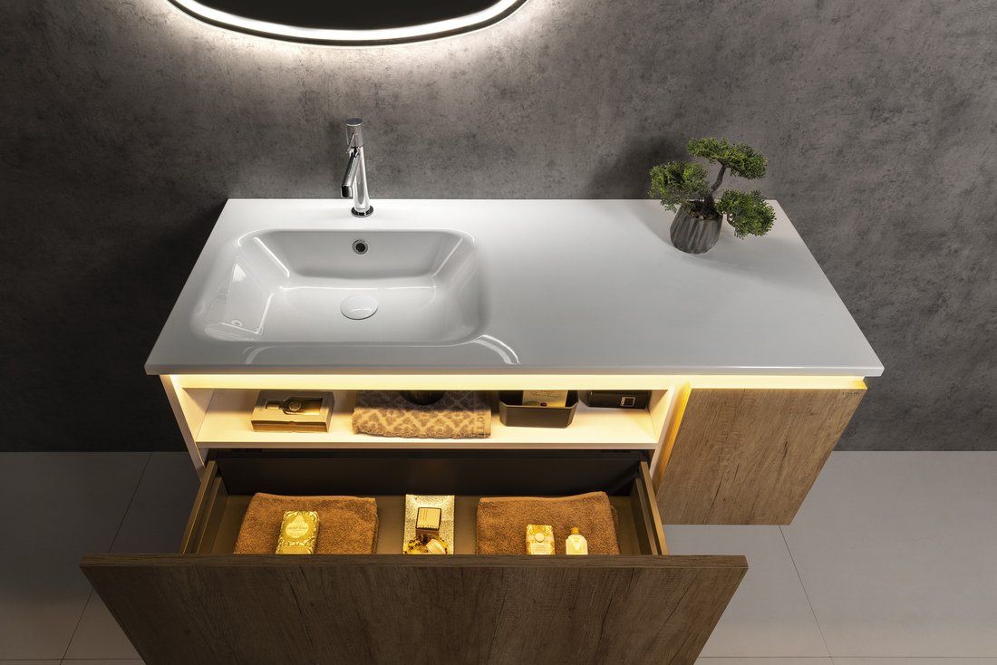 LOREA Schrank mit Waschbecken 101x46x51,5cm (70+30cm), links, Eiche Alabama/weiß matt