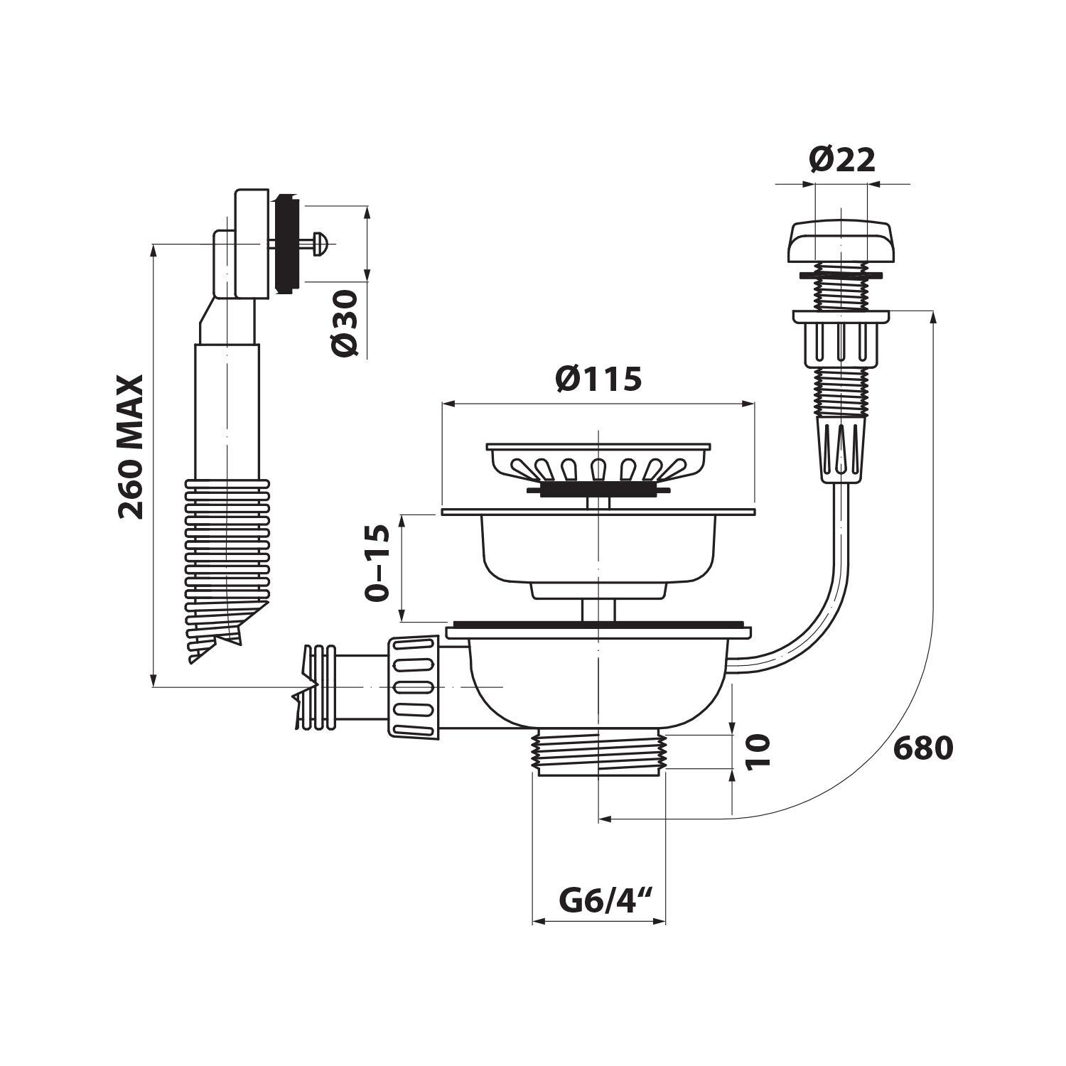 Waschbecken edelstahl auslass 6/4" mit Überlauf und Kontrolle, Edelstahl
