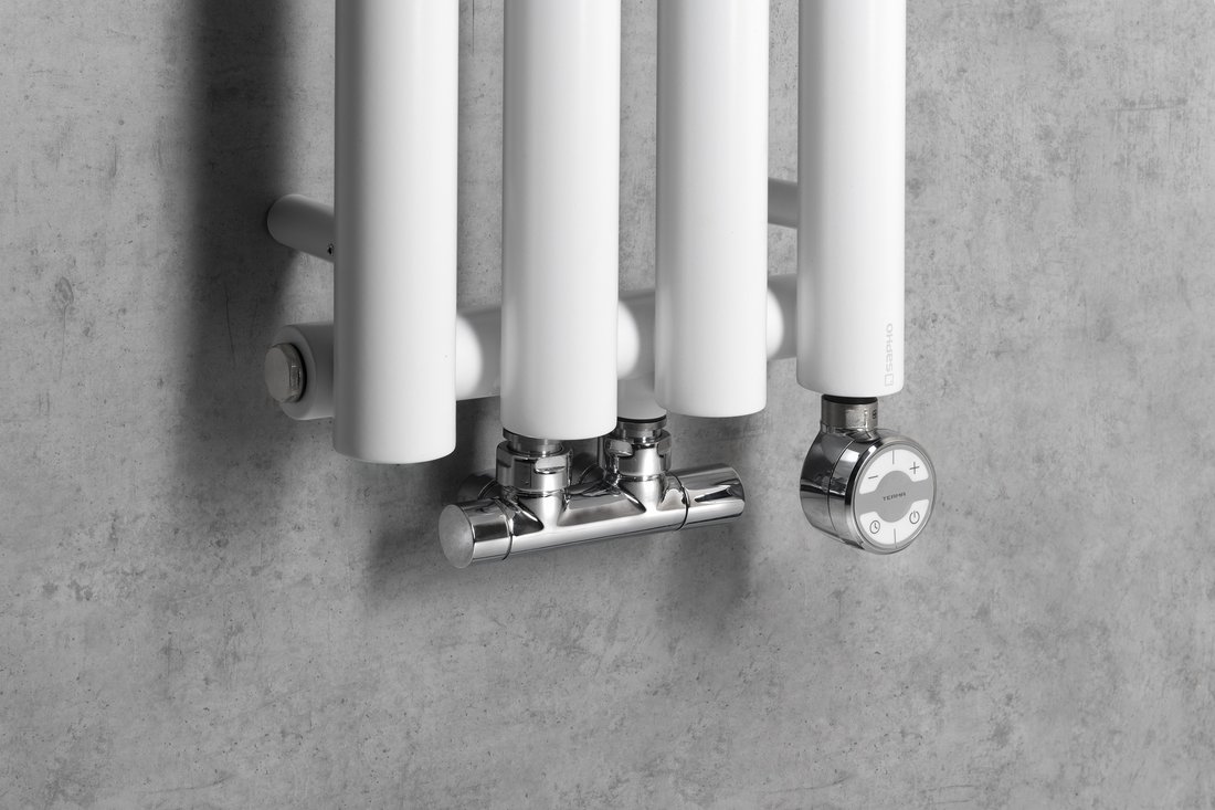 A valve with a thermostatic head: the integrated thermostat maintains the temperature inside the towel rail. The thermostatic head must be located at the hot water inlet (except MONO ONE).
