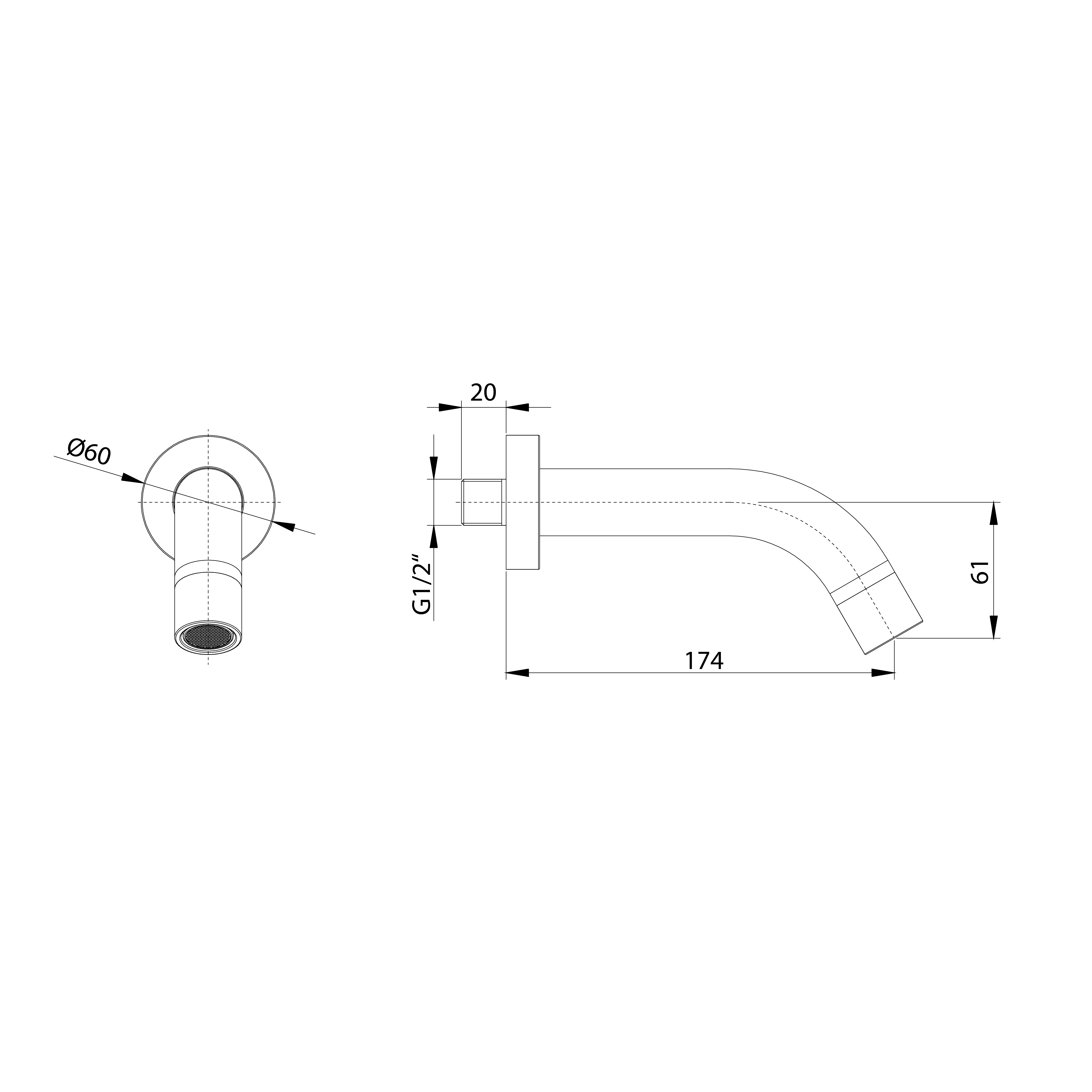 Wall mounted spout, round, 174mm, copper matt