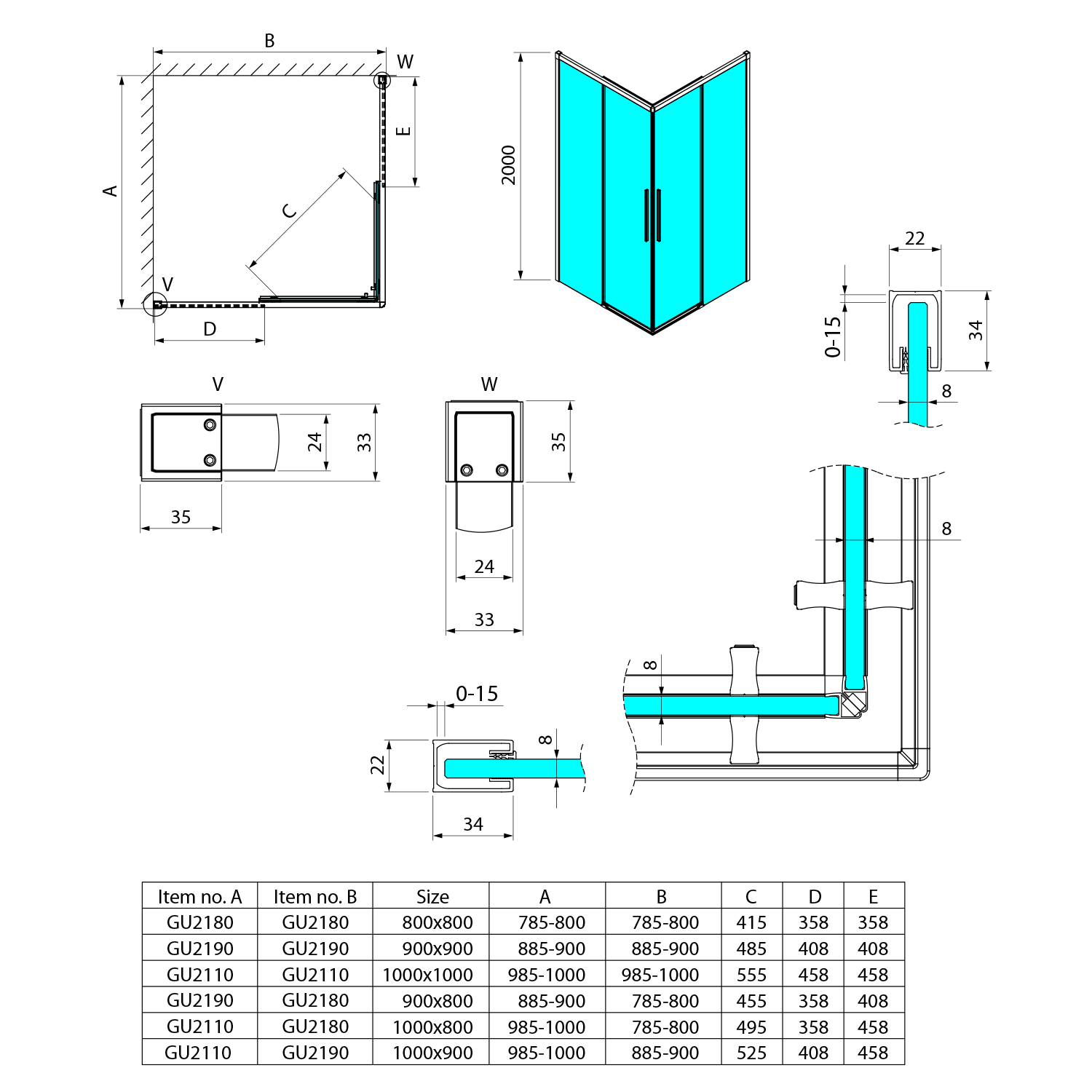 LUXOR GOLD MATT drzwi wejście z rogu 900mm, szkło czyste