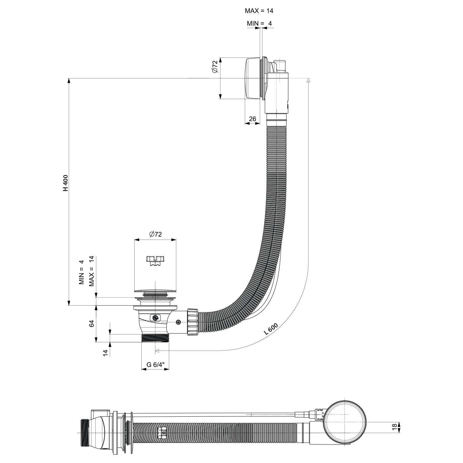 Zestaw odpływowy z korkiem automatycznym, długość 600mm, korek 72mm, czarny mat