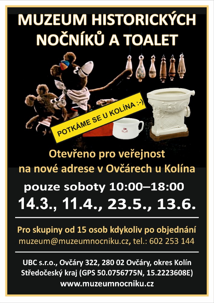Sme hrdí, že v spolupráci s manželmi Sedláčkovcami otvárame v priestoroch SAPHO Koupelny v Ovčáry pri Kolíne najväčšie múzeum historických nočných nádob a toaliet na svete. Expozíciu múzea môžete navštíviť v sobotu 14.3., 11.4., 23.5.,13.6. alebo si dohodnúť prehliadku s lektorom (minimálne 15 osôb).